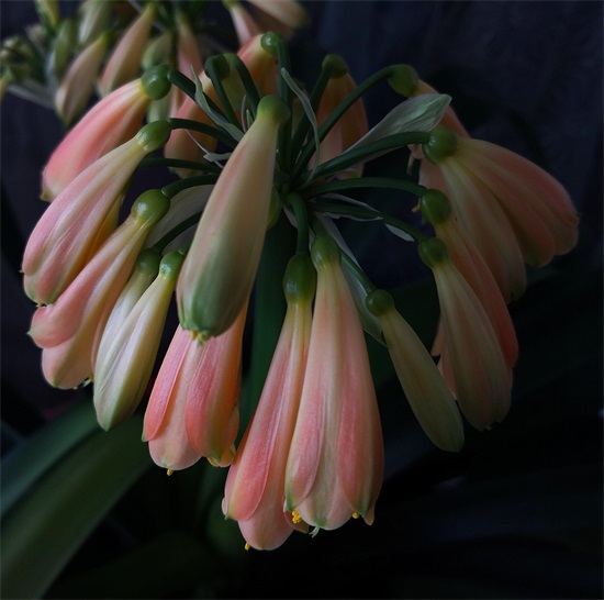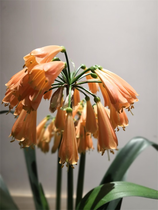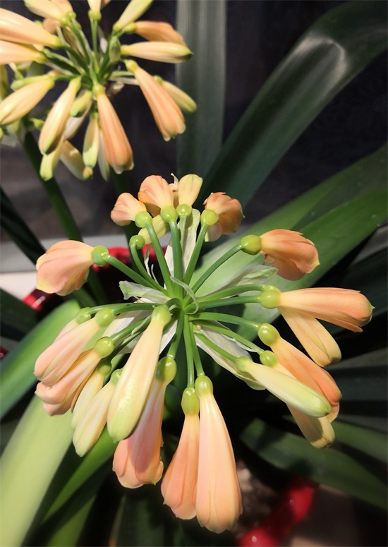正月初一,君子兰像是掐准了时间欣然盛开,低头含笑的样子如一群古典美女,端庄典雅。虽然株形不够优美,但叶片苍翠挺拔、花大色艳。