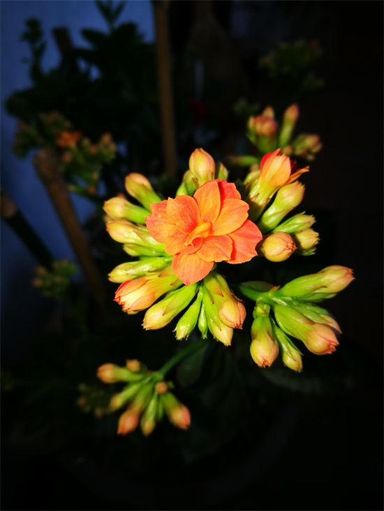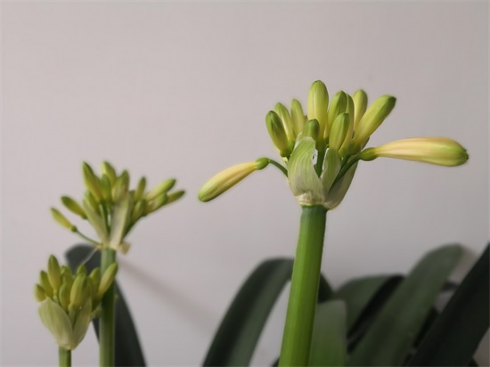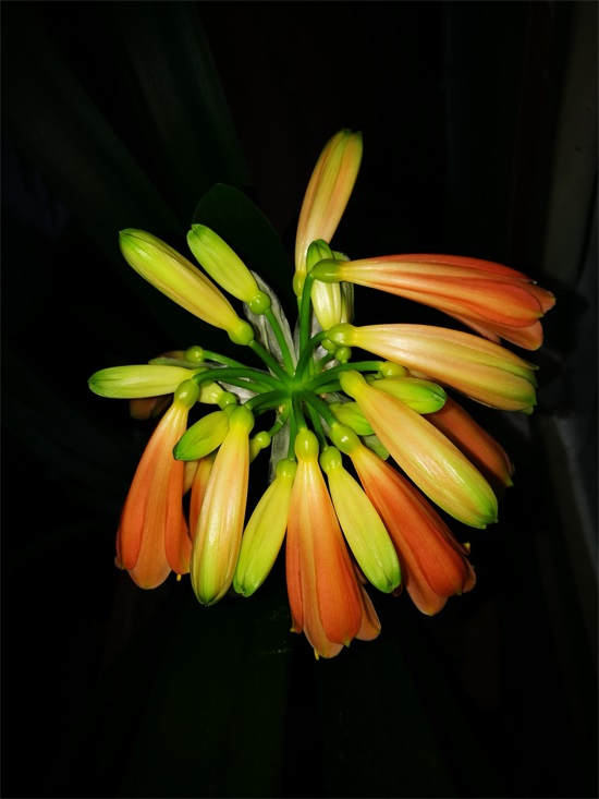 解绑之后,自由生长,君子兰花苞上的“手指头”越来越胖,颜色渐变为青黄、橙黄、橘黄、橘红。