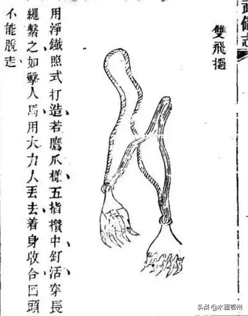 较重视擒拿的“挝”,其“挝”钩很可能可以活动,但目前缺乏实物保存下来,还有待研究。另外,还有用绳子牵引的“飞挝”,就是“飞爪”,不但能钩人还能用于攀岩越岭,后来传播到日本,深受日本忍者喜爱。