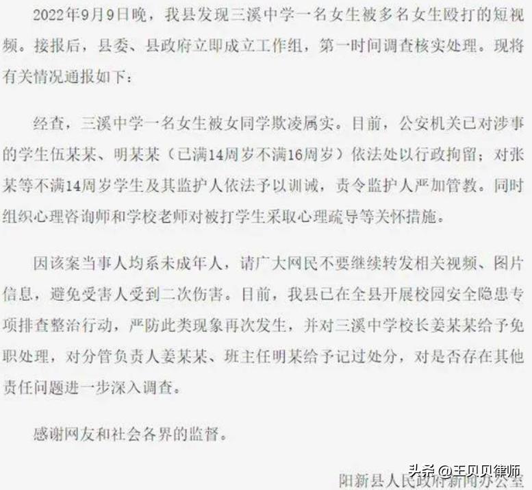 三溪中学校长被给予免职处理,分管负责人、班主任被给予记过处分。您认为校长和班主任应当对校园霸凌负责吗?欢迎在评论区留下您精彩的评论。