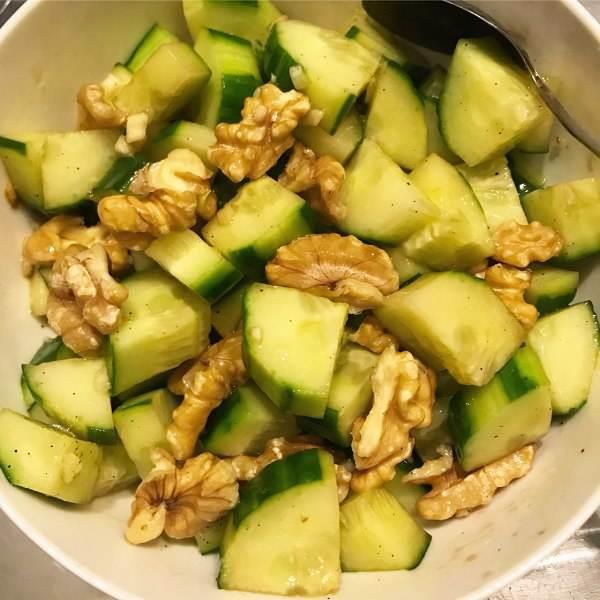 1. 黄瓜去皮,核桃开水泡10分钟去涩味