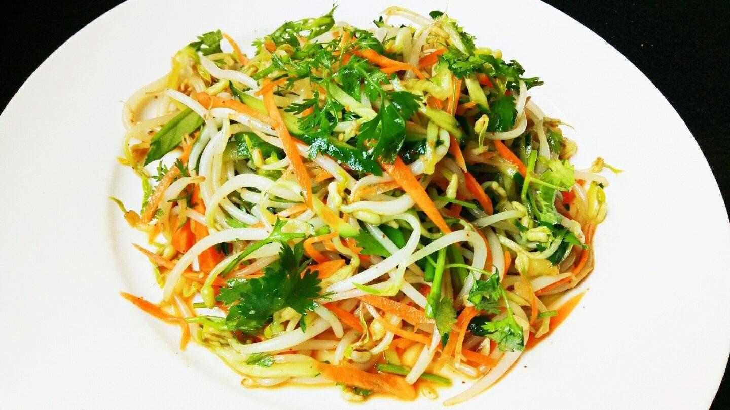 5. 在豆芽、黄瓜、胡萝卜丝中加入蒜末、适量盐、大量香油、少许生抽调味,用手尽量抓匀。放入冰