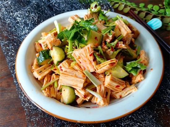 5. 搅拌均匀就可以啦(注意腐竹比黄瓜更吸盐,可以先将黄瓜腌制一下)