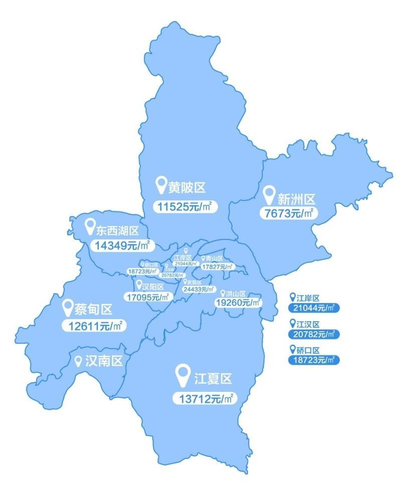 2019年5月,武汉13个行政区中,武昌区以平均单价24433元/平名列榜首,新洲区以平均单价7673元/平位于末端。7个中心城区,武昌区、江汉区、江岸区新房价格位居前三,成交套数较多的洪山区平均单价为19260元/平。此外,远城区中关注度较高(成交情况)的黄陂区、东西湖区和蔡甸区平均单价分别为11525元/平、14349元/平和12611元/平。