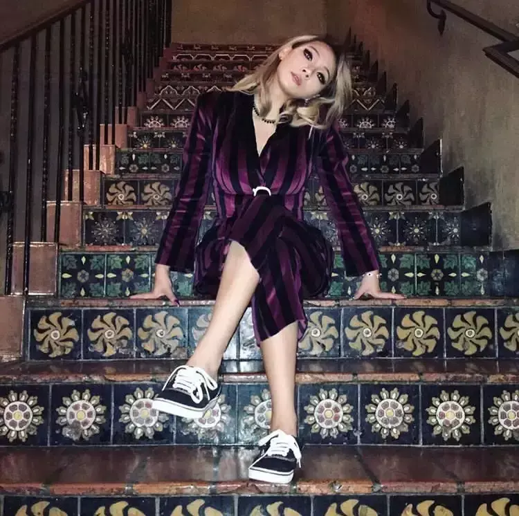 女王的衣着也是很有特色的,深紫色绒面套装非常显瘦又显身材,微微性感, CL混搭休闲鞋,平常想这样穿也没什么不可以,想走女王路线是不能害怕别人眼光的!高矮胖瘦都能美到不行~