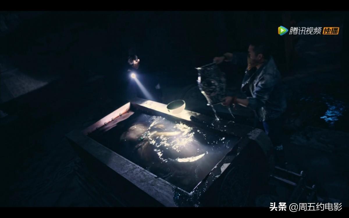 昏暗冰冷的镜头下,背影音乐营造的气氛应景,吴邪一行人在船老大的带领下披荆斩浪,遇鬼船、人面臁撒牛毛、海猴子样样不少。