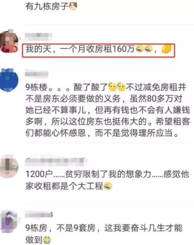 可是林萍君的做法是非常温暖人心的,她把自己所有的租客都减免了半个月的租金,对于林萍君来说也就是少了80万。