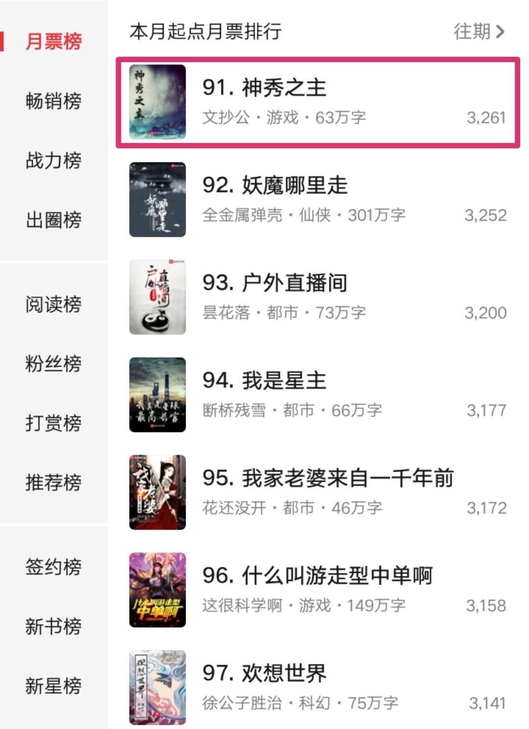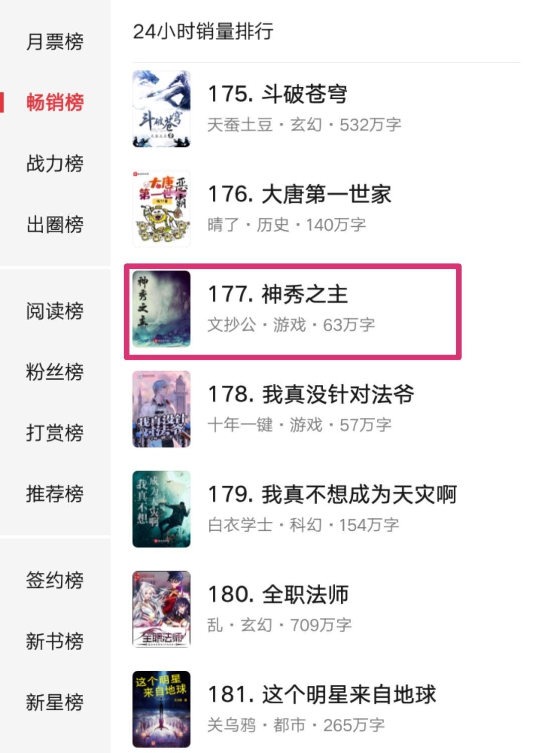 看了一下它在起点月票榜、畅销榜上的表现,还是比较靠后的。其中月票榜91名,畅销榜177名,也就是正常的精品小说的表现,希望它后续能有所提升吧。