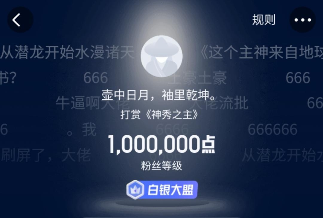 晚上在起点看小说的时候,发现有读者给大神文抄公的新书《神秀之主》打赏了一个白银大盟(相当于一万元),就好奇去看了一下。