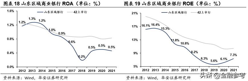 盈利能力方面, 山东区域银行ROA和ROE自2018年开始稳步回升,至2021年ROA均值为0.46%,ROE均值为7.33%。