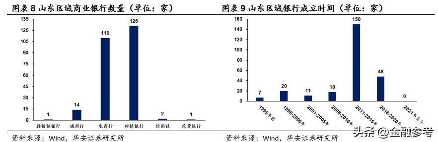 山东省现阶段共有254家商业银行。按银行类型划分,村镇银行126家,农商行110家,城商行14家,信用社2家,股份制银行1家,民营银行1家。按成立时间划分,2006-2010年、2011-2015年、2016-2020年山东分别有18家、150家、48家商业银行成立。
