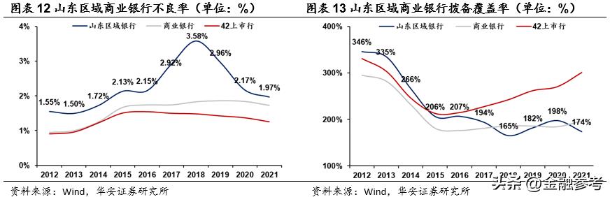 山东区域银行不良率边际改善。不良率方面,山东区域商业银行不良率自2018年起逐年下滑,至2021年为1.97%,但高于商业银行与42家上市商业银行均值。拨备覆盖率方面,2021年山东区域商业银行拨备覆盖率为174%。(注:算数平均计算区域内银行不良率及拨备覆盖率,部分银行披露数据不全,计算结果可能存在一定误差,下同)