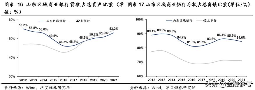 资产负债结构方面,山东省加大信贷资产投放力度,贷款占总资产的比例稳步回升,至2021年比重达到53.2%,负债端中存款占比维持在84%的水平。