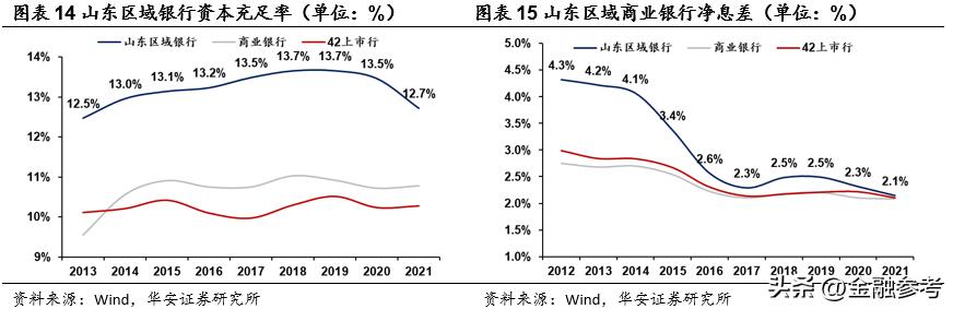 核心一级资本充足率、净息差高于商业银行均值。资本充足率方面,截至2021年山东区域内银行核心一级资本充足率为12.7%,高于商业银行均值与42家上市行均值。净息差方面,山东区域内银行净息差2021年为2.1%,高于商业银行均值与42家上市行均值。