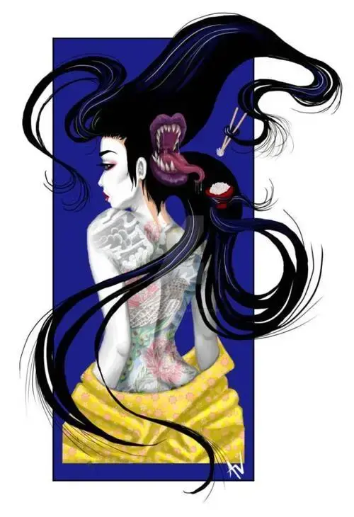 百鬼夜行中记载:凡是不检点、随地大小便、有夫偷人、举止轻浮的女性,都会被稻荷神发现。家中死过孩童的,或者杀死过幼儿的,就会被其童傅申,使她们的后颈长出第二张嘴。