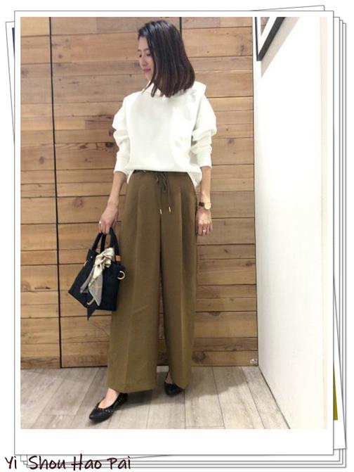 选择白色的连帽卫衣和漂亮的阔腿裤,适合成熟女人的精致休闲穿搭。高腰和中线设计效果很好,给人以干净利落的印象。