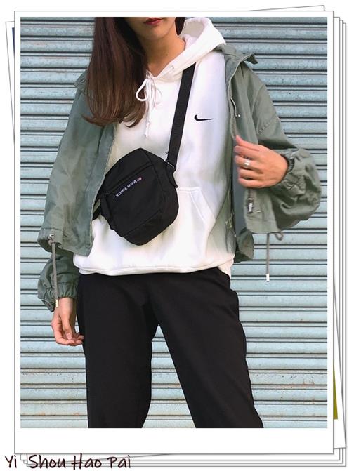 休闲时尚的军装风外套搭配白色连帽卫衣搭配非常不错!选择运动型单肩包搭配会很适合。