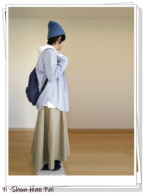 在长裙和白色连帽卫衣上搭配薄衬衫。仅添加一种轻质材料,即可获得清爽的效果。适度华丽的蓝色配饰也非常适合造型!