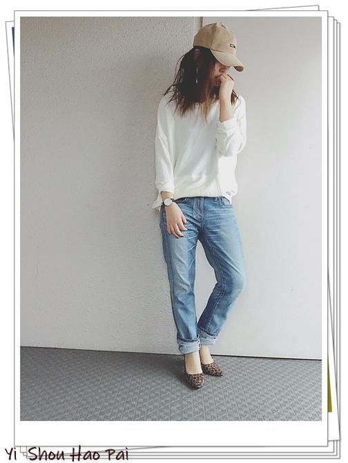 推荐男朋友牛仔裤作为宽松的连帽卫衣的搭配!牛仔裤也有合理的空间,因此与卫衣的平衡非常完美。脚上有豹纹鞋,很时髦。