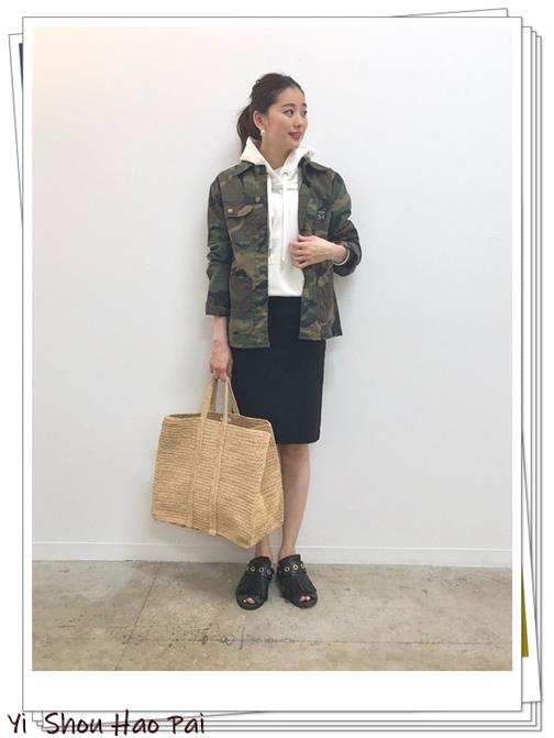 军装外套搭配白色连帽卫衣和紧身裙相结合。头发扎起来,会更时尚。