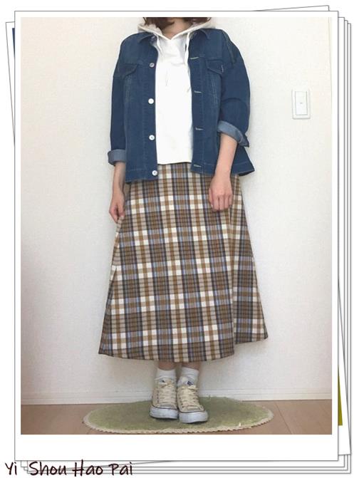 格仔裙搭配可爱的白色连帽卫衣!选择棕色或橙色以保持搭配感,这种颜色不挑季节使用。搭配设计整洁的牛仔夹克以保持整体休闲感。