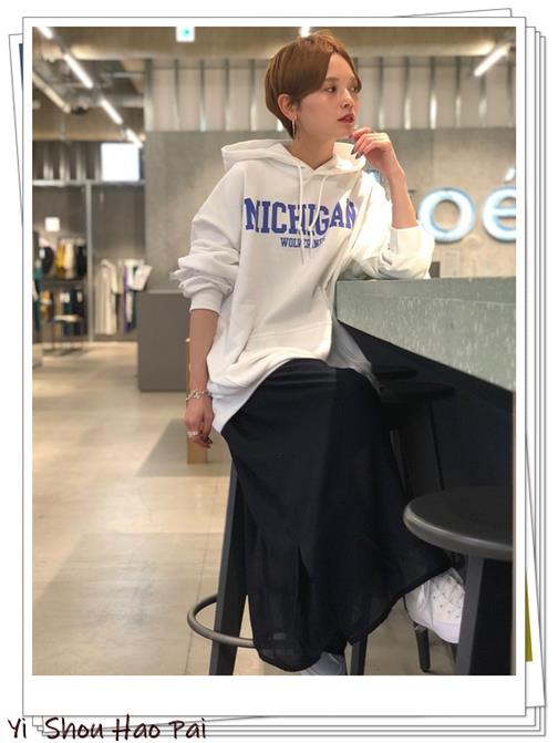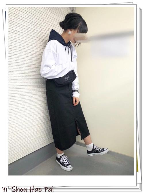 如果要让白色连帽卫衣看起来成熟,建议穿一条直的长裙!如果选择黑色,则与板鞋搭配时不会显得太幼稚。