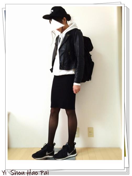 不要错过白色连帽卫衣和机车皮夹克的组合!白色卫衣略微软化了机车夹克的硬朗感觉。请尝试以紧身裙和透明的打底袜的女士装扮完成造型。