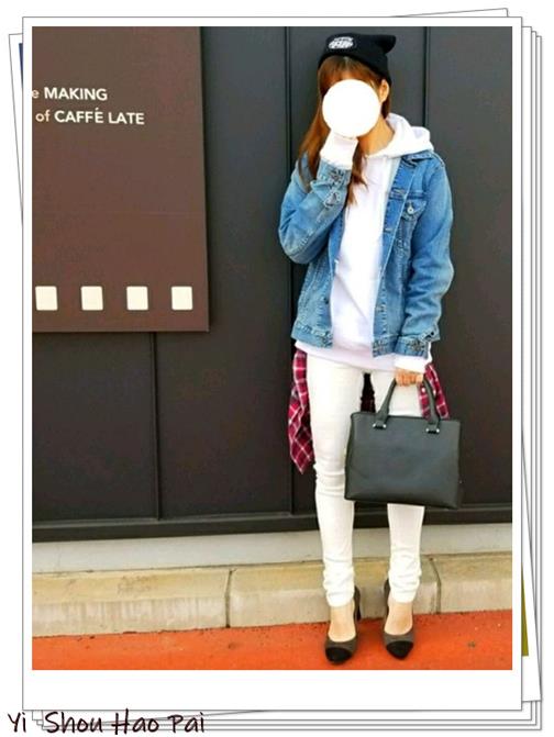 白色长裤搭配白色连帽卫衣很合身!垂直线相连,给人以显高的印象。你可以通过牛仔夹克和格子衬衫来增加造型的趣味