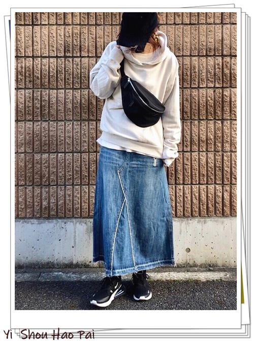 白色连帽卫衣搭配裙子。即使在看起来较大的牛仔裙中,它们也具有整洁的外观。