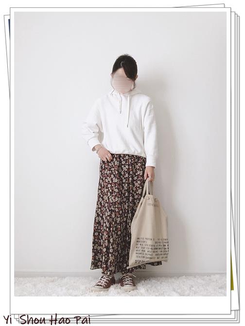 春夏季白色连帽卫衣建议使用植物花卉半身裙搭配。如果它是基于棕色的设计,那么即使是成熟女人也很容易尝试。通过将鞋的颜色与裙子搭配,完成统一感。