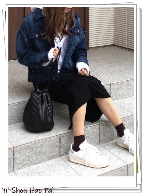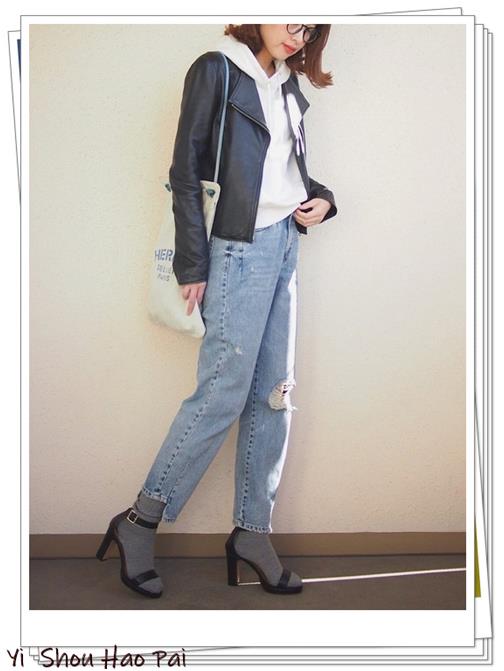 建议搭配白色连帽卫衣的街头休闲牛仔裤和机车外套!稍微添加美丽的元素。敢于添加灰色袜子来增加亲切感是时髦技巧。