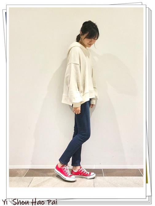 如果你穿着白色的连帽卫衣,请使用红色作为鞋子的颜色。休闲造型完成,即使是成熟女人也很容易驾驭!