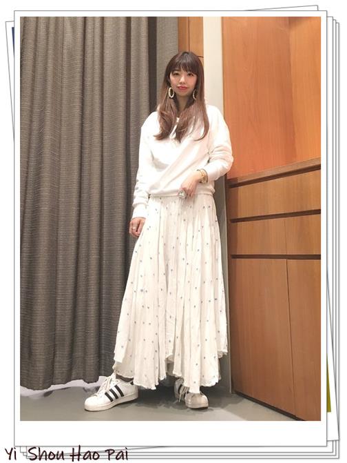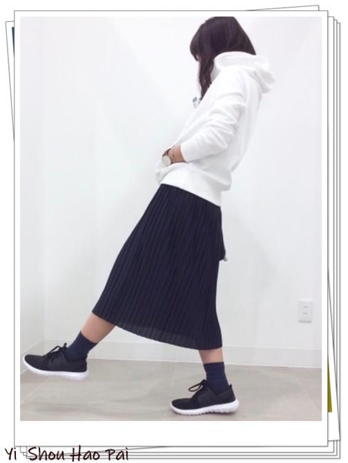 如果要女性化运动白色连帽卫衣造型,建议使用喇叭裙!即使色彩受到抑制,由于透明的材料,它也能给人以华丽的印象。