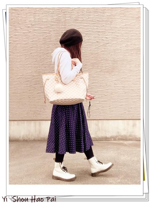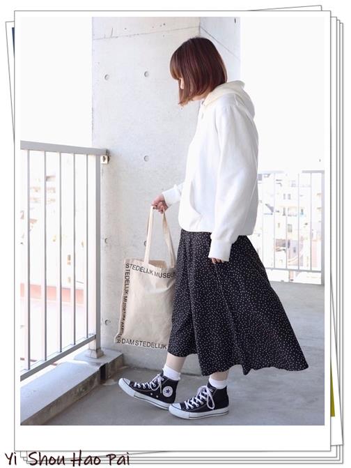 可爱的白色卫衣的造型,搭配圆点裙。每次走路时,你都可以享受一种柔和的女性气氛。穿着白色靴子的休闲装使得甜美感觉降低。
