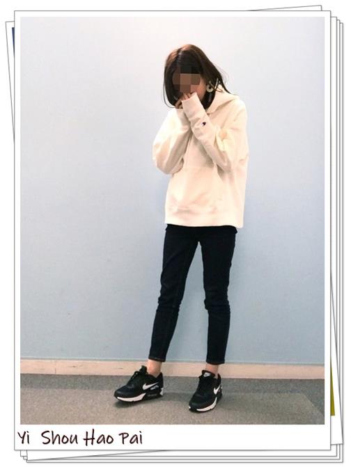 紧身牛仔裤推搭配超大号白色连帽卫衣!因为搭配了运动鞋,所以毫无疑问是运动休闲风格。选择和裤子同样颜色的鞋子将进一步增强腿长效果。