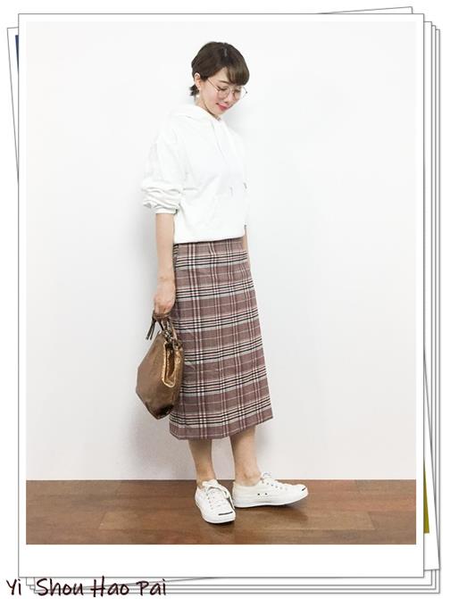 当你既想拥有可爱又沉稳时,格子图案紧身裙非常有用,很适合休闲白色连帽卫衣。保持脚踝和手臂露出的造型!