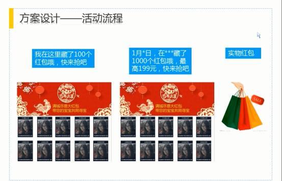 我们打算做一个以抢红包为主题的活动——“满城找红包,到店来寻宝”。原因有二:首先,抢红包,这给客户一个实惠感,又应春节的景;其次,我们又满足了客户的一个新鲜感,因为我们嫁接了一个新产品——AR实景红包。