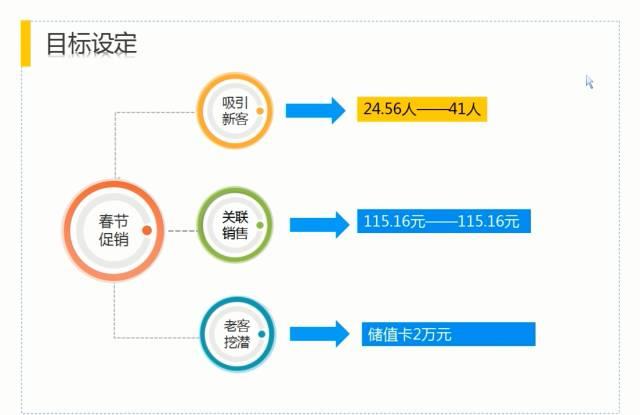 因此我们这个春节促销首要目标是吸引新客户,按我们全年日均新客25个,根据行业平均水平,春节新客数要比日常增加71%,因此我们的春节促销新客引流目标应达到日均41人;关联销售只要保持不下降就好,在老客挖潜上,我们的目标是2万元的储值卡。