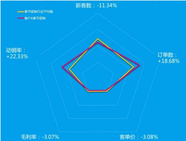 这张图是根据我们门店往年春节数据做的,通过跟行业均值对比,发现原来在订单数和动销率这两块完成的还不错,都高于均值;毛利率和客单价受订单数影响有所下降,但并不明显。可在新客数这块比行业平均水平低了11%,说明我们在原来的春节促销中活动宣传力度不够,新客引入有所欠缺。