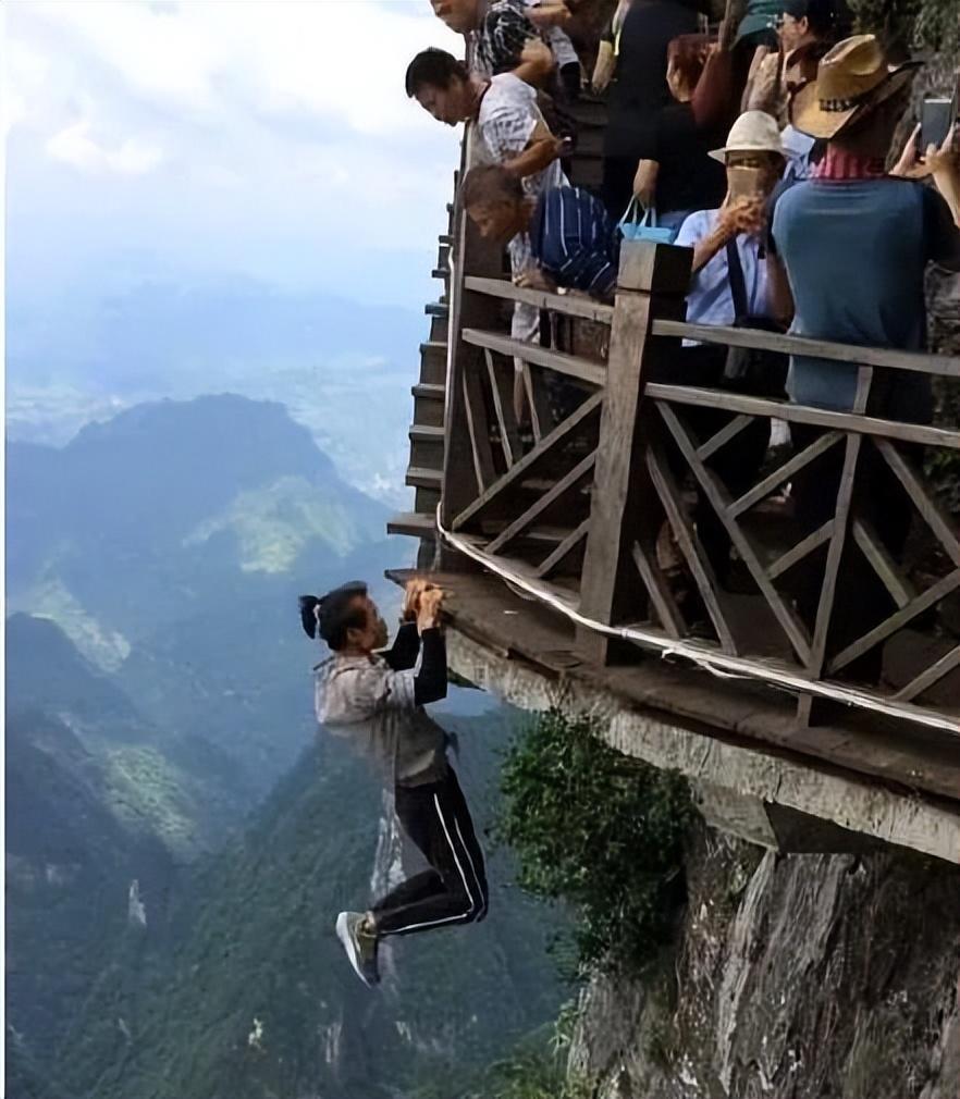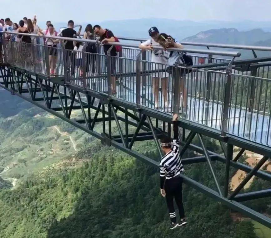 双手悬浮在空中栈桥,引得桥上旅客惊叫连连。