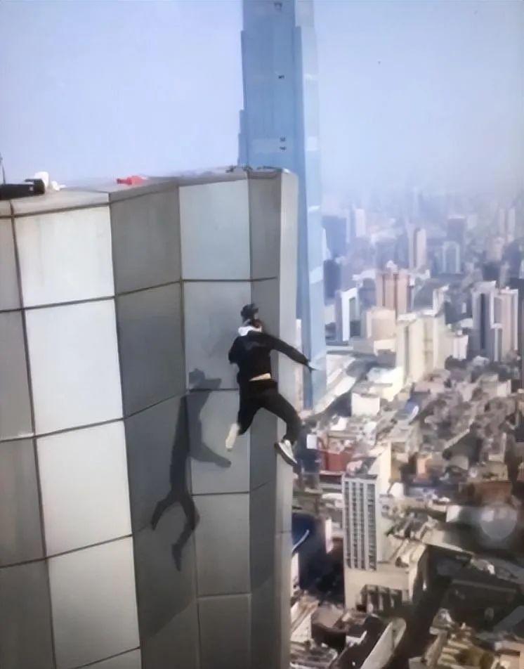 单手悬浮在高楼墙面上,摆出“猴子观海”的动作;