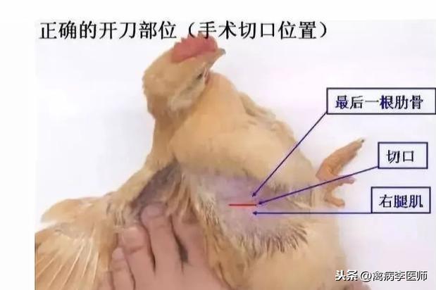 第一步:切口皮肤错位左手拇指按住鸡的尾根部向前推动使躯体前移,保持鸡只的两腿相对地伸直,用食指确定切口位置在肋骨的椎骨部与胸骨部交界的上缘(第六肋间隙或最后肋骨后缘),并固定切口部位的皮肤使其自然错位,这样术后皮肤可自然覆盖切口。