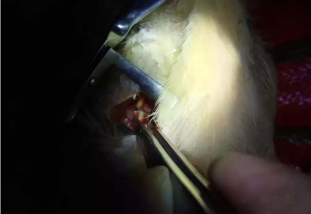 (4)阉割后不能握住鸡的两翼,这样容易造成气肿,更不能使鸡头下垂,否则易造成口腔出血。