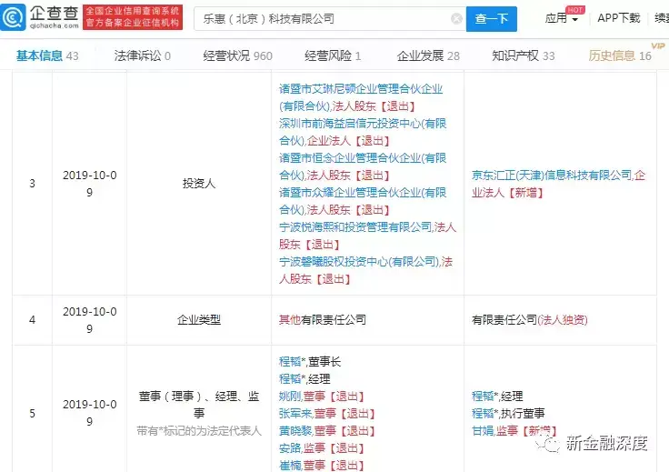 企查查显示,10月9日,乐惠的运营主体乐惠(北京)科技有限公司发生多项工商变更,其中多位投资人退出,转由京东汇正(天津)信息科技有限公司(下简称“京东汇正”)100%控股,而京东汇正为北京京东金融科技控股有限公司全资子公司。与此同时,公司多位董事退出,新增甘娟为监事。公司类型变更为有限责任公司(法人独资)。