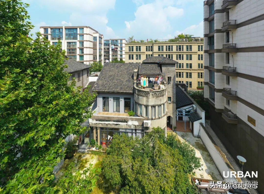 ▲旧仁和邨原本有7幢民国洋楼,在开发房地产时拆掉了4幢,仅剩下了5号(双剑楼)、6号(闻宅)和9号楼(可庐)三幢。从空中俯瞰保留下来的三幢别墅,有圆筒楼的即为双剑楼。