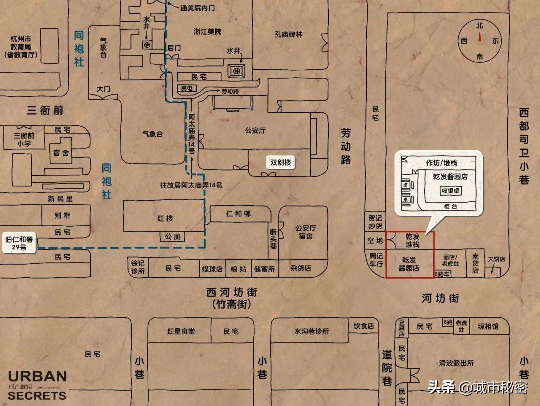 旧时的河坊街,往西与劳动路相交而止,再往西,便叫竹斋街。在竹斋街的后背面,有一段相平行的小街,由东向西,从旧仁和邨至旧仁和署。