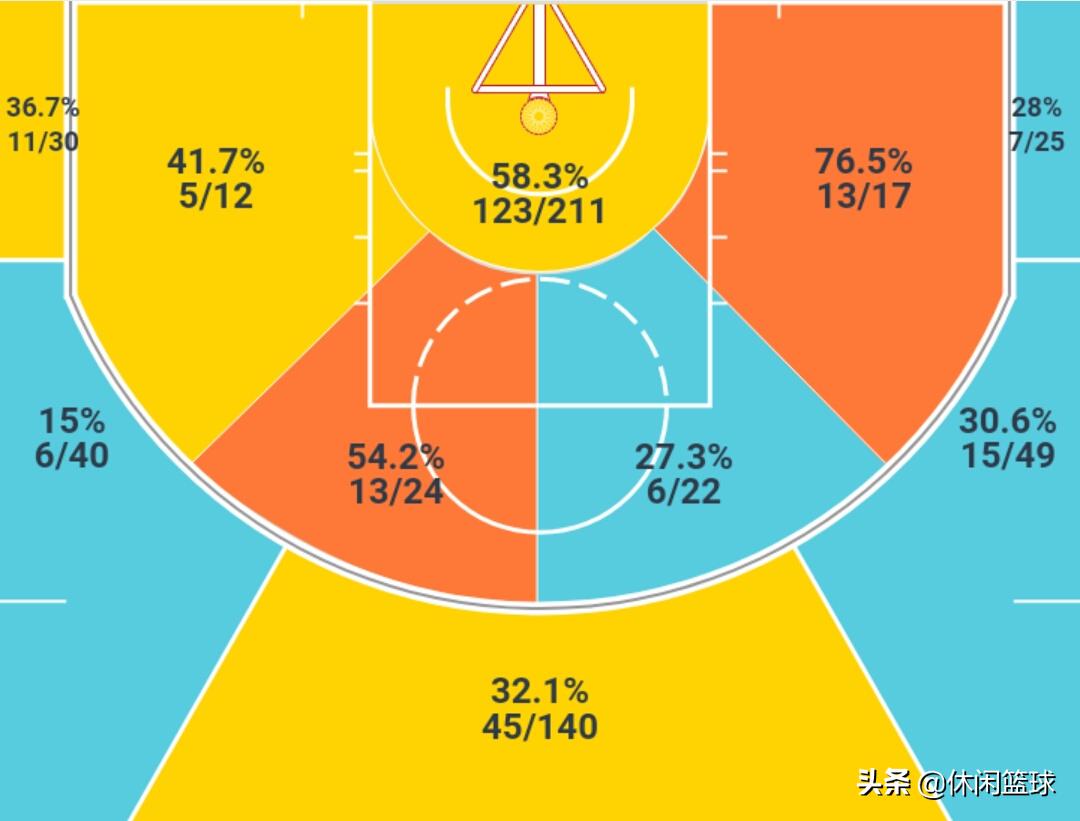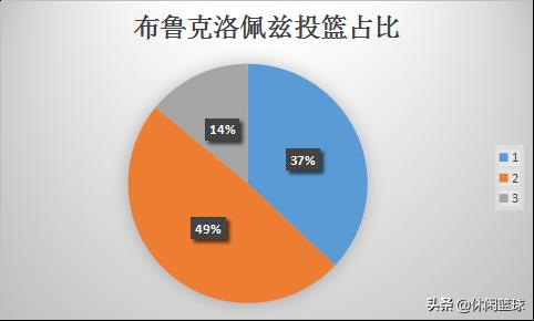 从图中我们可以看到,布鲁克洛佩兹在禁区内有着58.3%的命中率,中距离里有着大约45%的投篮命中率,尤其是在底角一侧命中率达到76.5%,在三分线外,布鲁克洛佩兹的三分投射偏差,只有90°角正对篮筐,以及左侧底角三分的三分命中率达到联盟平均水平约35%的命中率,其余都低于联盟平均水平。尽管如此,拥有三分投射能力的布鲁克洛佩兹给对手带来的杀伤力也是不可小瞧的。分析洛佩兹的出手占比,可以看到洛佩兹在三分线以外的投篮占据了自己全部出手次数的49%,可见三分也是洛佩兹进攻的主要手段。