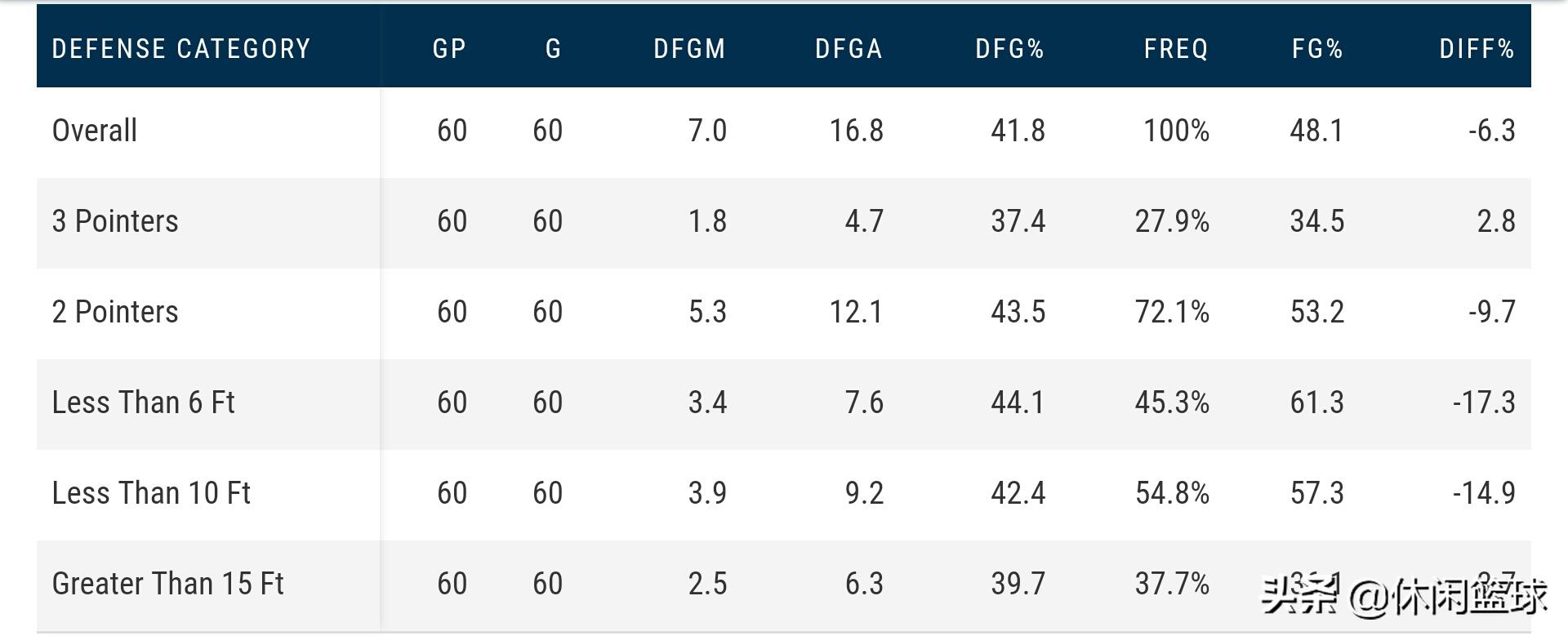 从具体数据来看。洛佩兹在防守外线投射三分时,会让对手命中率上升到37.4%,比平时高了2.8%,这也源于洛佩兹的脚步缓慢,不能马上跟近对手,防其投三分,但这并不能表示洛佩兹的防守能力不行。不可否认的是洛佩兹在三分线以内的强悍防守。有着2.13米的身高,2.27米的臂展,让洛佩兹在防守中距离,近距离投篮非常有优势。我们从图中可以看到,洛佩兹在防对手中投时可以将其命中率降低至43.5%,比球员平时的命中率足足低了9.7%。在近距离看,少于10英尺内的投篮,洛佩兹对对手命中率的影响又上升了,可以将对手的命中率限制为44.1%,比平时低了17.3%的命中率。小于6英尺内的投篮,可以将对手命中率限制到42.3%,比平时低了14.9%的命中率。我们可以得出,洛佩兹有着优异的内线防守能力。是一名攻守兼备中锋。也是冠军球队在内线防守所需要的顶级保障。
