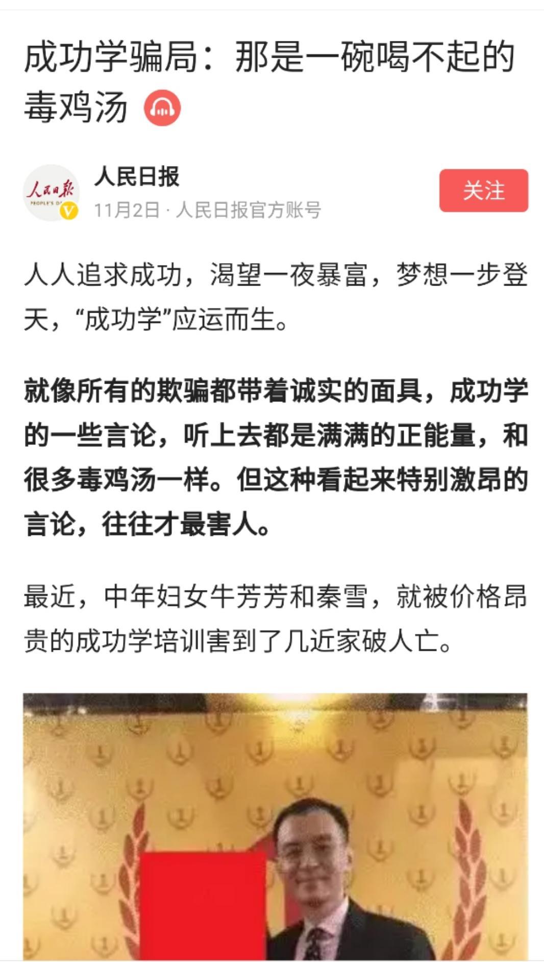近日,人民日报点名批评陈安之的成功学是一碗"毒鸡汤",引发了无数网友关于成功学的讨论。