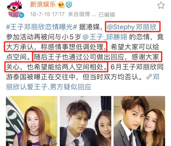 王子好像一直很御姐控,跟邓丽欣在一起之后也挺坦荡,有晒过两人大头照。